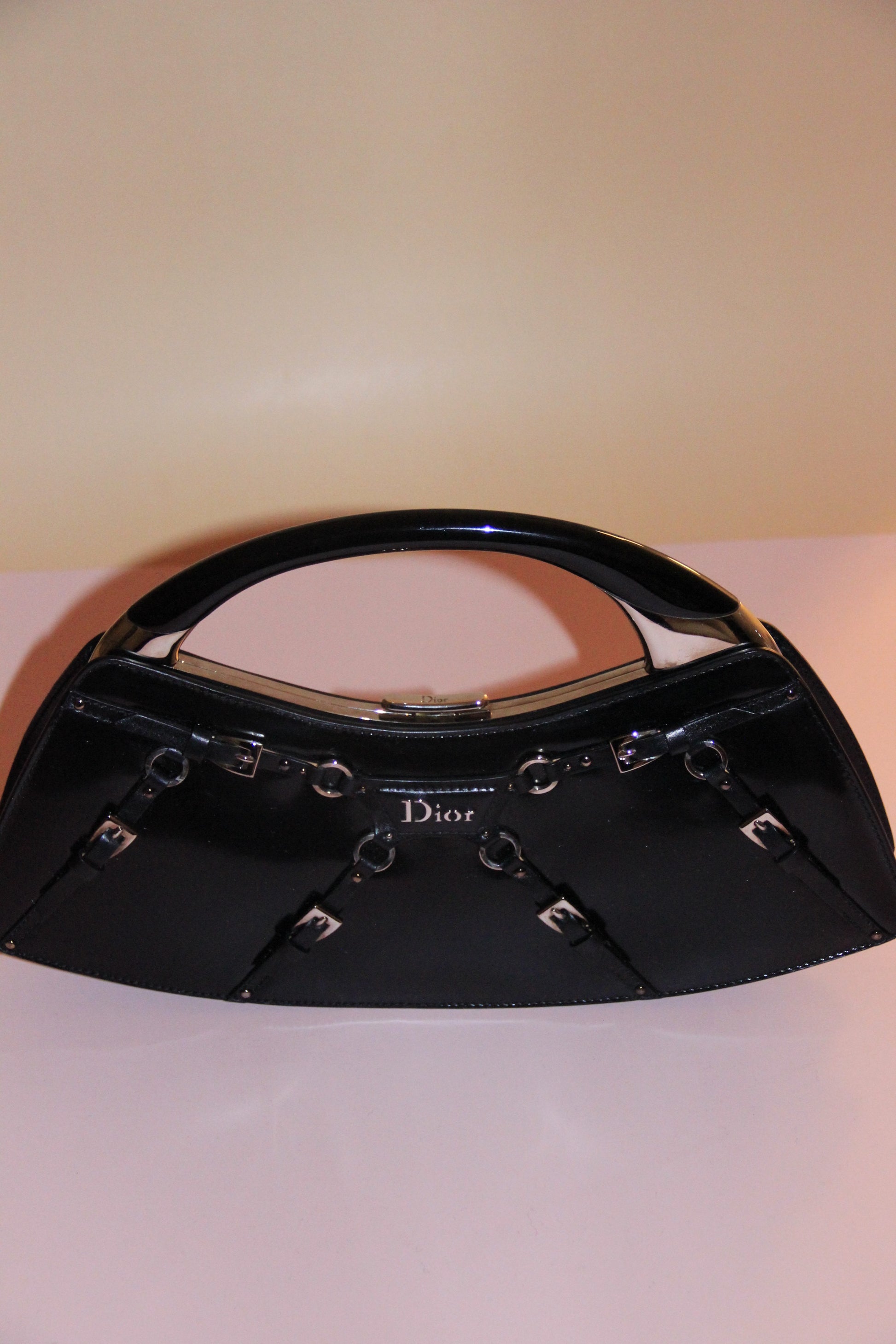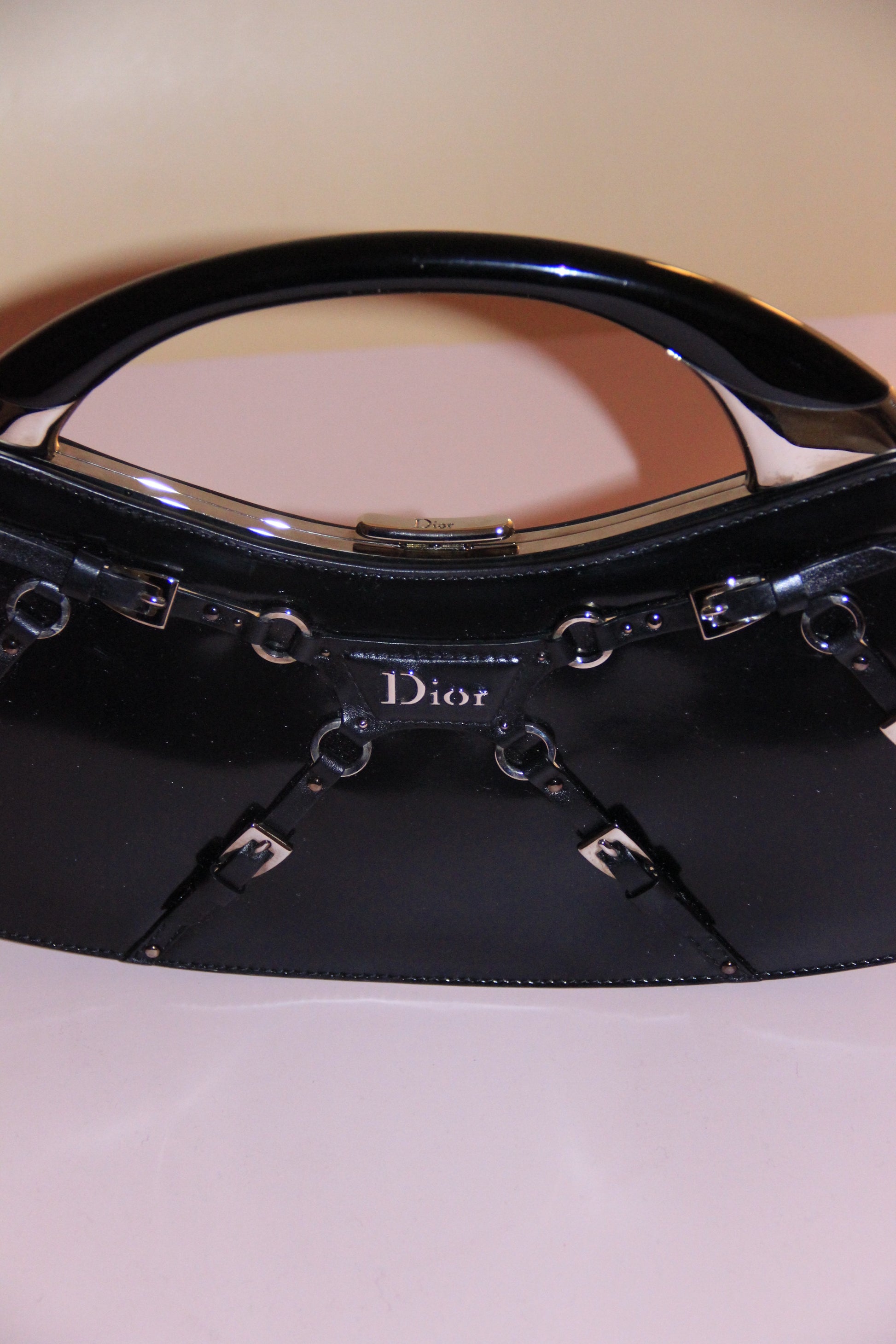 Modèle très rare, sac Dior 'Bondage' cuir vernis noir by Galliano, avec anse en métal et boite d'origine. Ce sac à main Bondage est un vrai objet de collection pour les connaisseuses et les amatrices de mode vintage.
