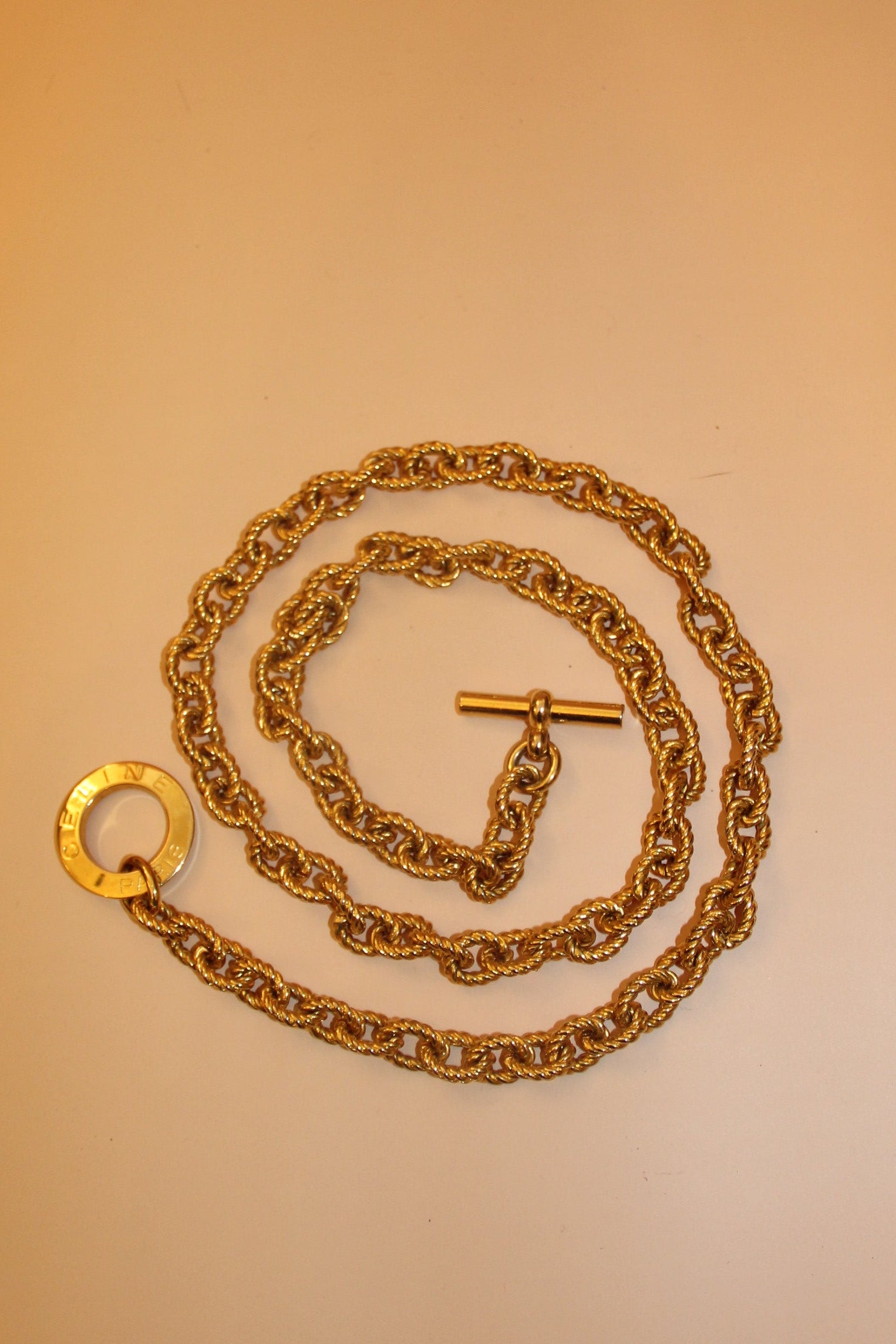 Ceinture Vintage (années 80-90) Céline, total longueur 96cm, chaine à mailles torsadées dorées bronze, fermoir en T avec un très beau monogram Céline sur la boucle. Ce produit est une pièce de collection.