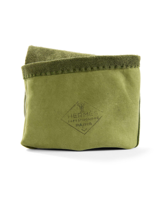 Le sac se distingue par son fermoir Palonnier en métal plaqué or, directement inspiré de l’univers équestre, emblème historique de la maison Hermès. Les gants, conçus dans le même cuir suédé, complètent l’ensemble avec une rare cohérence stylistique.
