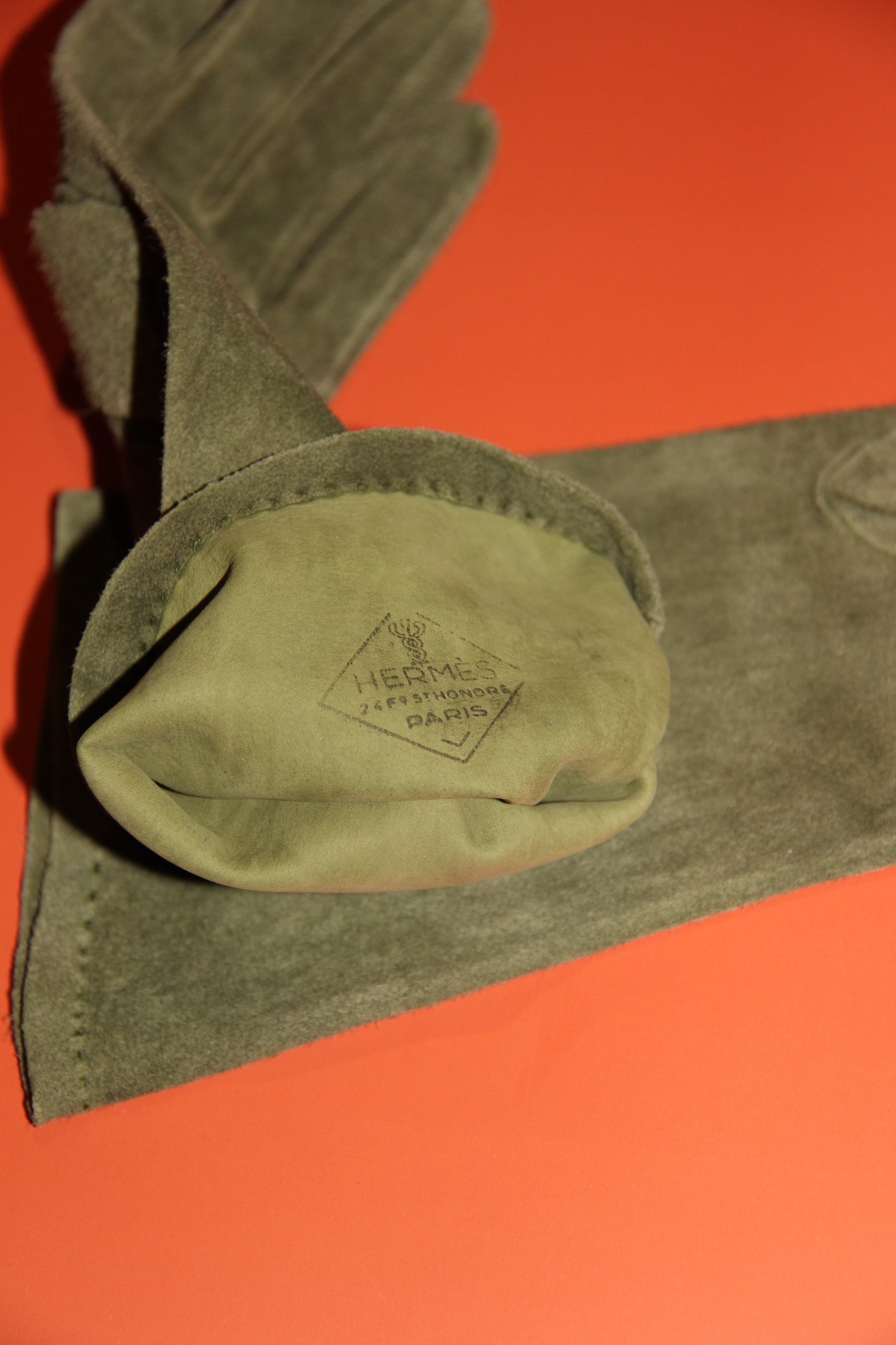 Rare et élégant ensemble Hermès vintage, composé d’un sac à main modèle Palonnier et de sa paire de gants assortis, réalisés en veau doblis (veau de glisse) de couleur kaki, datant des années 1960.