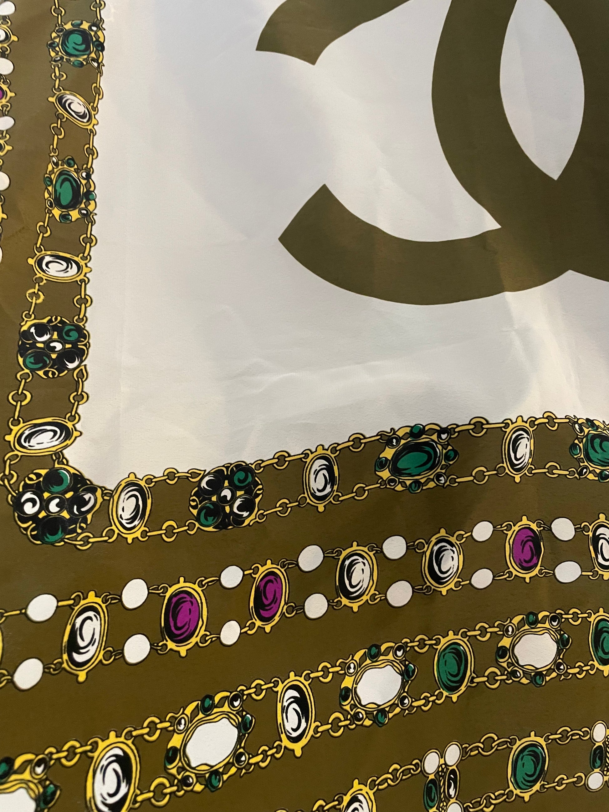 Magnifique carré de soie de la Maison Chanel, fond écru et Monogramme kaki, 100% soie de 85cm, motif bijoux gripoix.