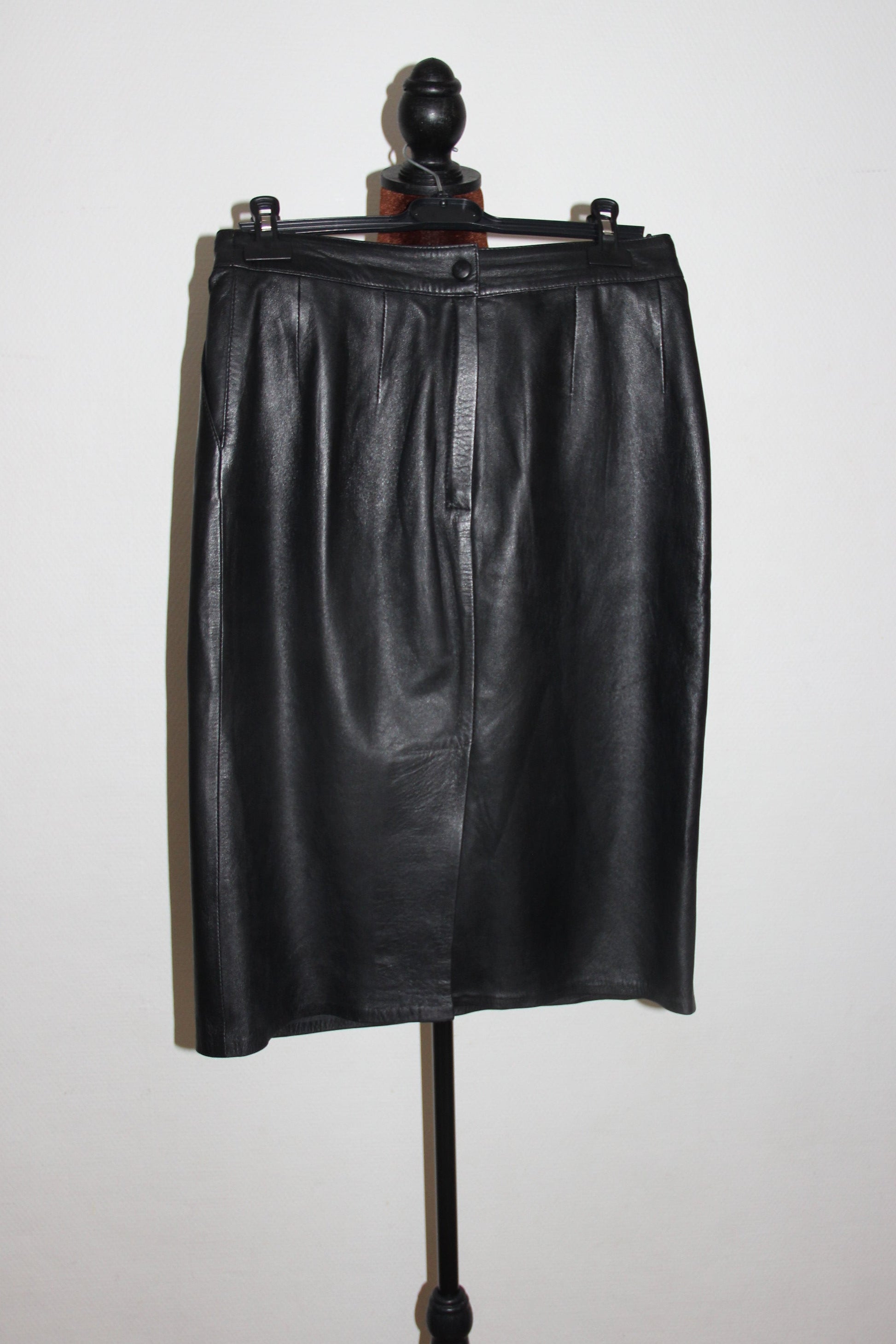Jupe en cuir noir, coupe droite crayon dessous le genou, fermeture éclair dans le doc, bouton, et petite fente.