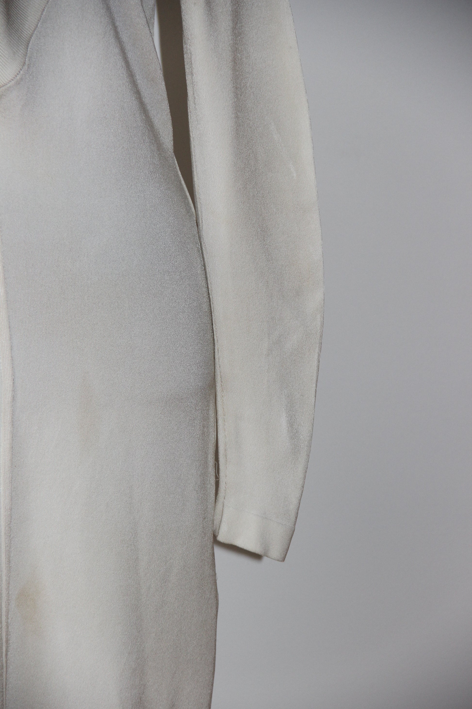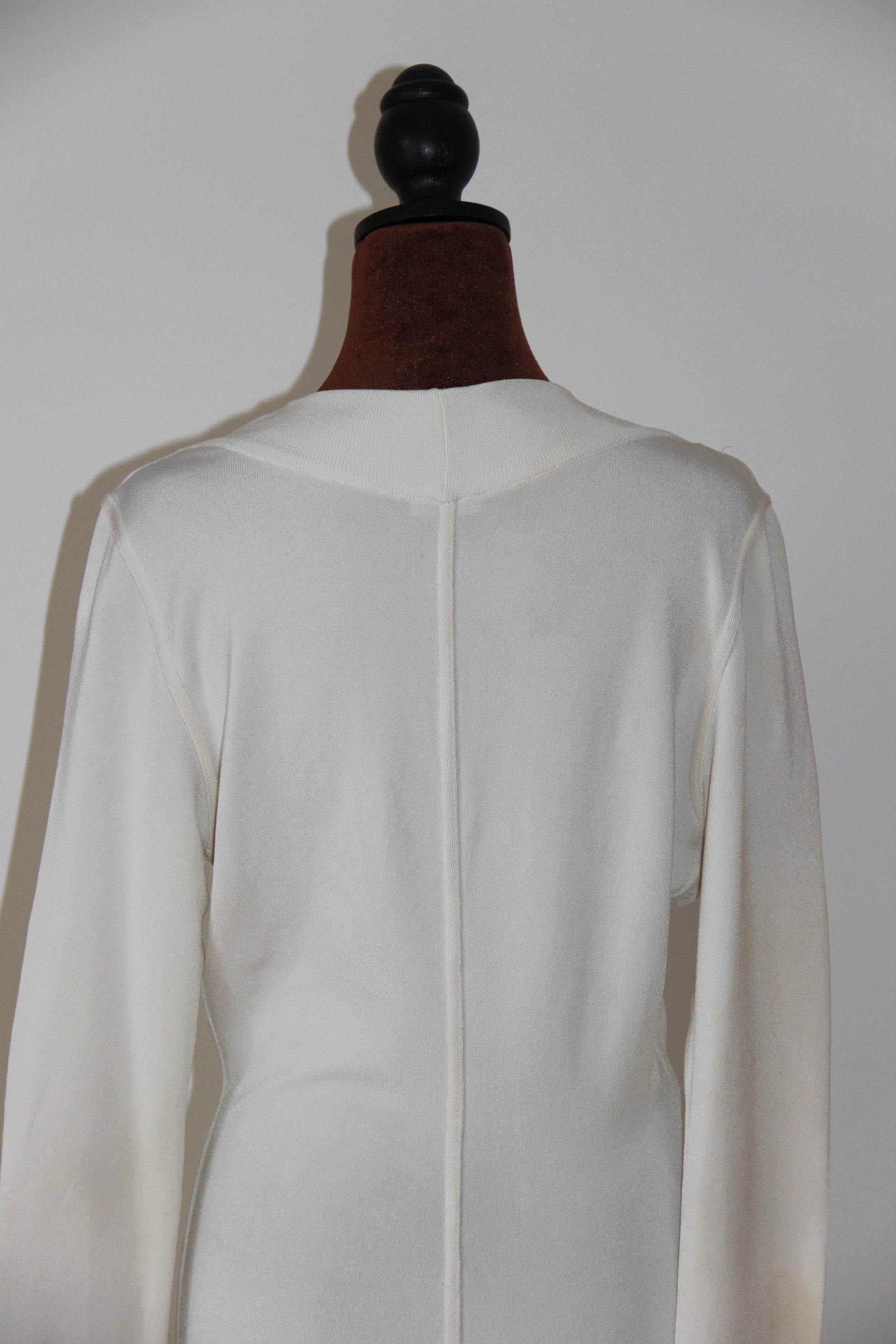 Ravissante robe en maille écrue d’Azzedine Alaïa, col en V décolleté, manches longes, moulante avec petit volant en bas de la robe - dessous genou. Cette robe raffinée incarne parfaitement le savoir-faire de la marque.