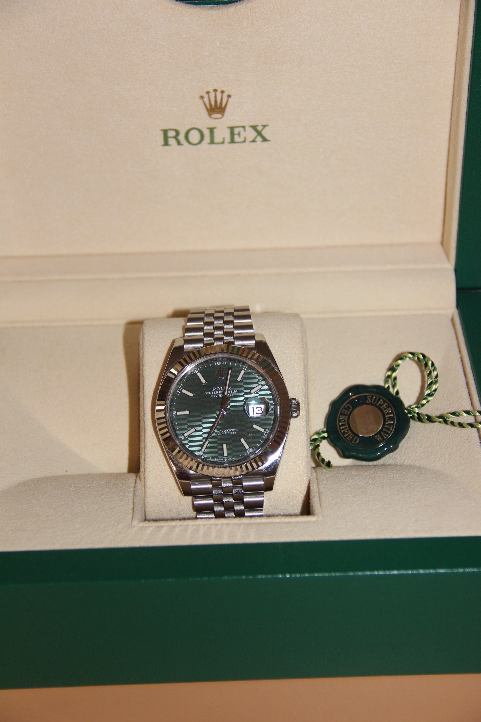 Montre Rolex exceptionnelle, modèle Datejust certifié très rare pour homme en 41mm Jubilée, couleur Green jubilée avec Box & Papers. Authentification par notre équipe et professionnels de l'horlogerie.