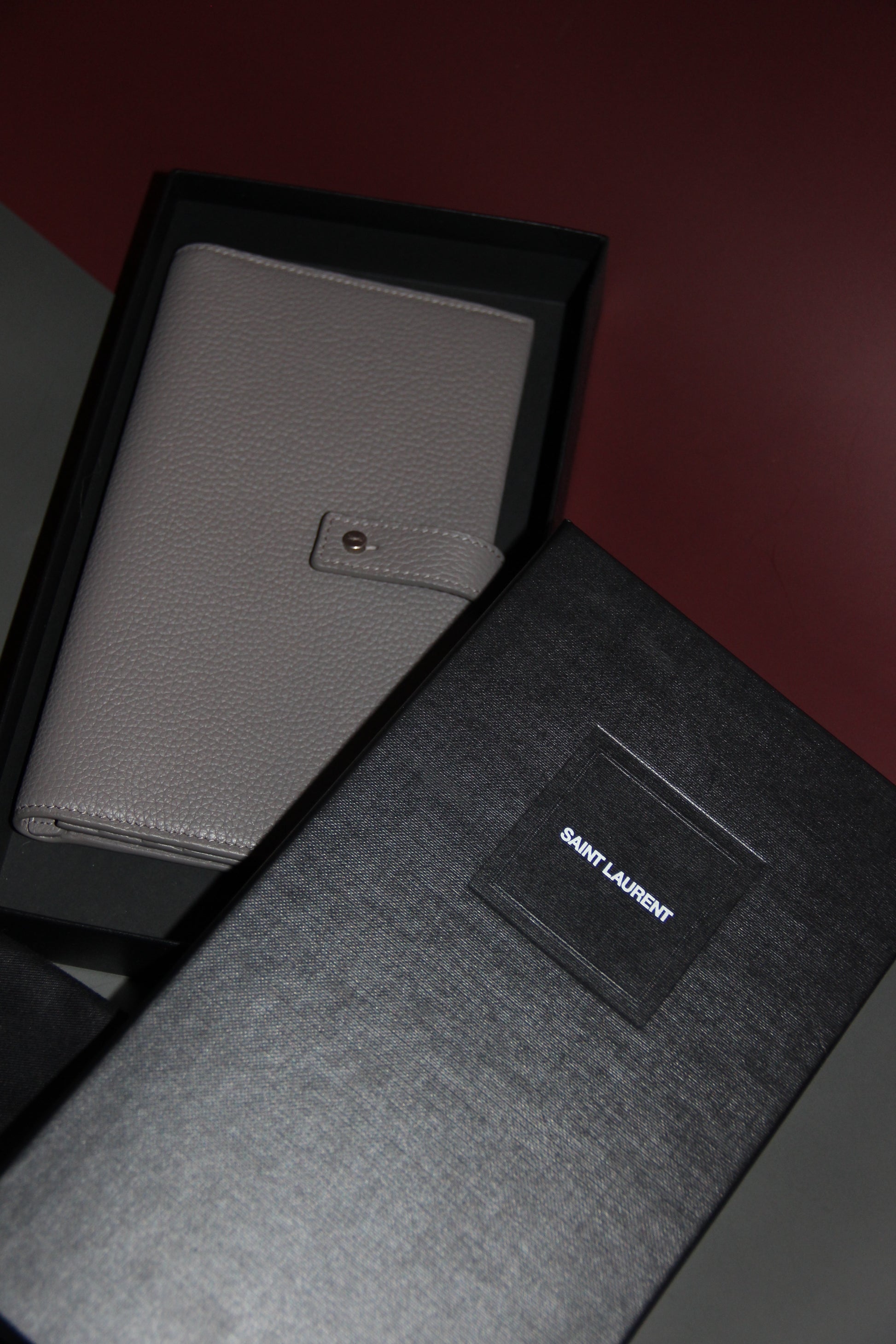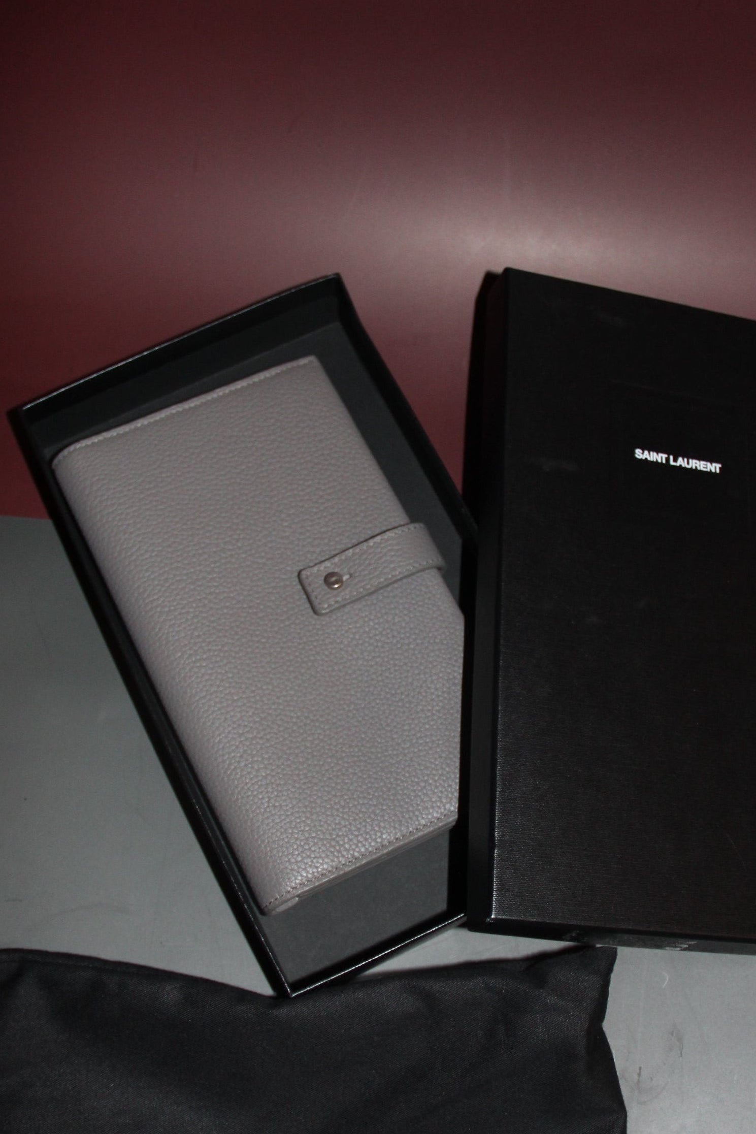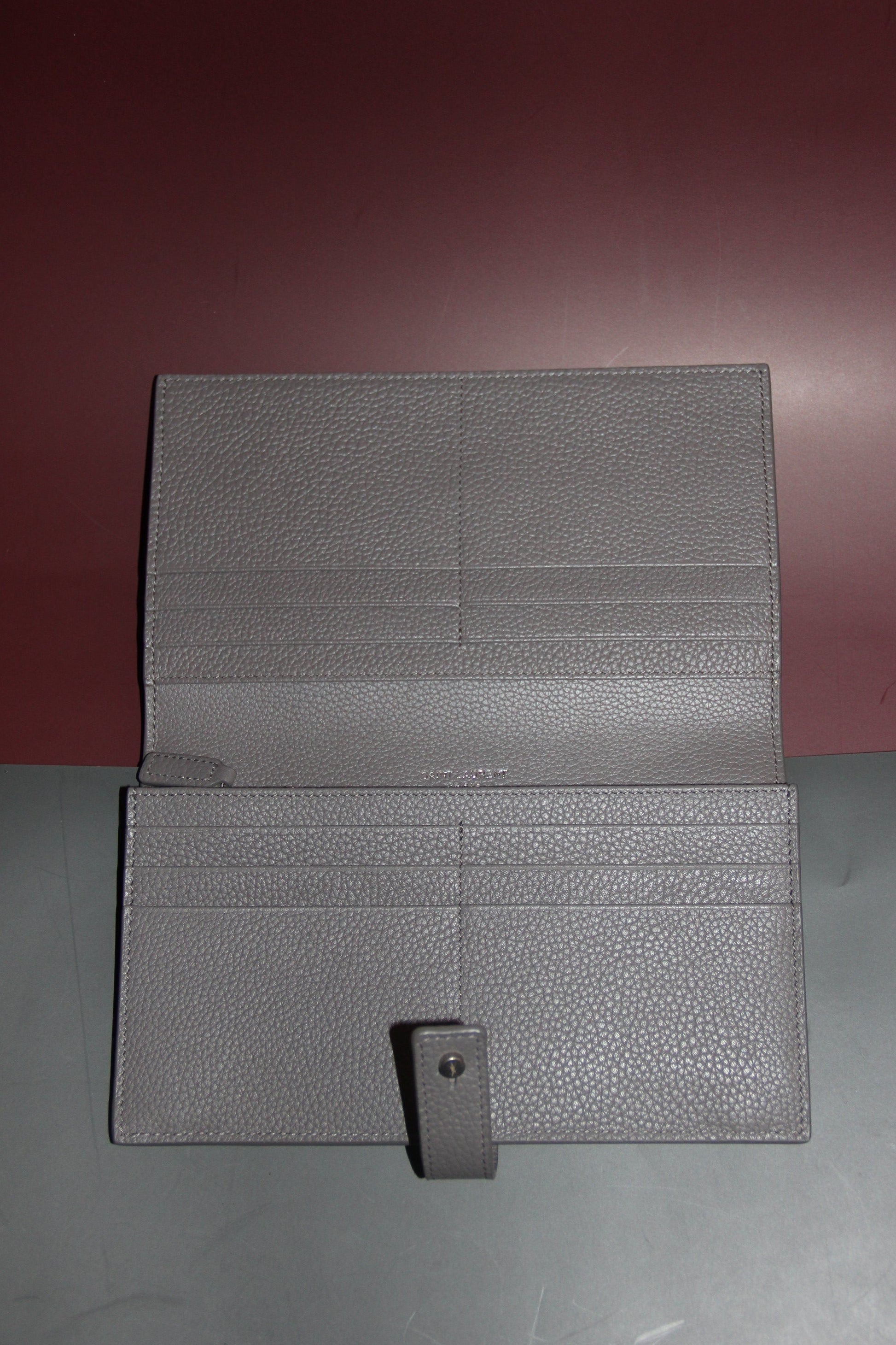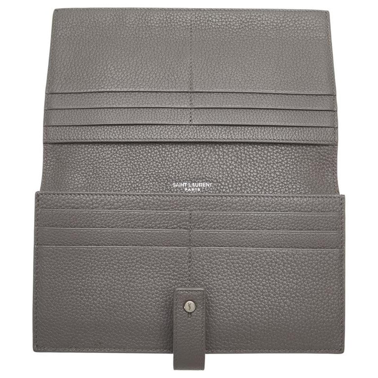 Magnifique portefeuille long YSL en cuir grainé neuf avec étiquette de couleur gris.