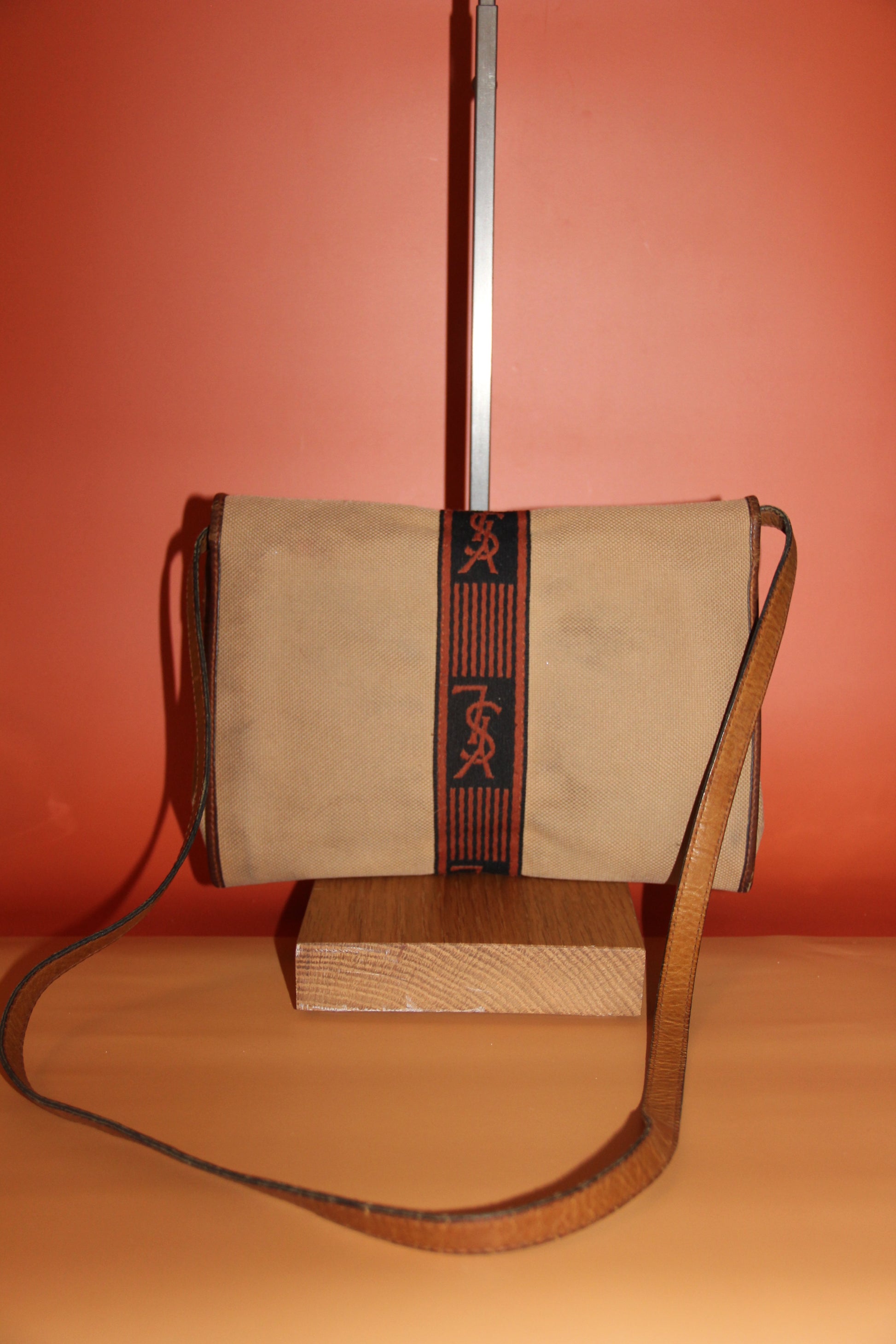 Sac bandoulière vintage de la marque Yves Saint Laurent, style safari en toile beige, monogramme YSL.