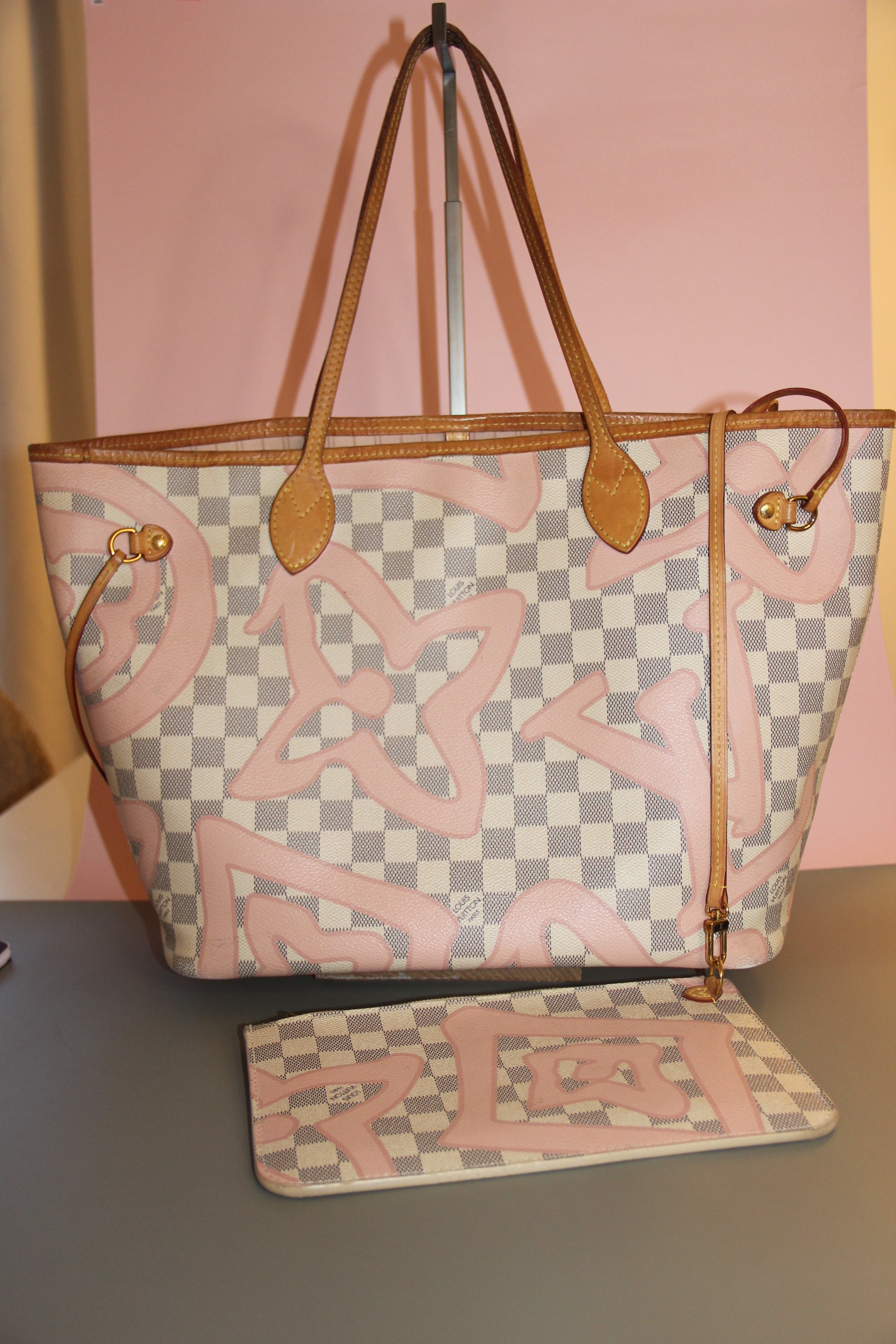 The Louis Vuitton Limited Edition Damier Azur Tahitiennes Neverfull MM Bag has fashion and functionality all rolled into one. One of the most popular LV styles, the MM is the mid-size of the LV Neverfull family. This limited edition features Rose Ballerine Monogram flowers. Its roomy capacity, versatility and durability makes it perfect for taking to the office or going shopping. In fact, each of the handles is capable of resisting up to 231 lbs.! And finally, this bag is reversible and the inner canvas can be exposed for a chic and casual look.
