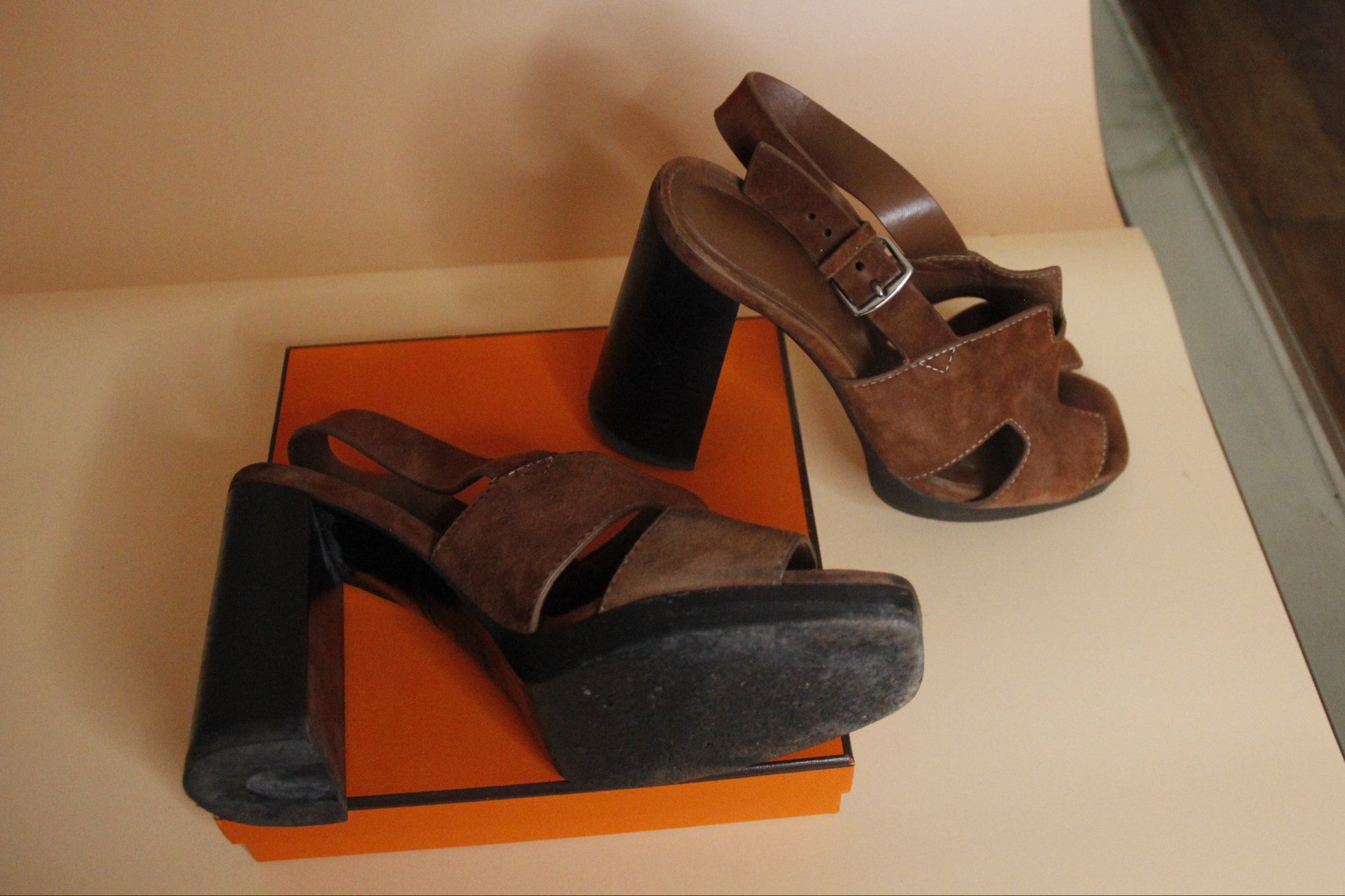 Sandales Hermes Elbe 60 en daim marron taille 38 pour femme à talon. (5 UK / 7 US)