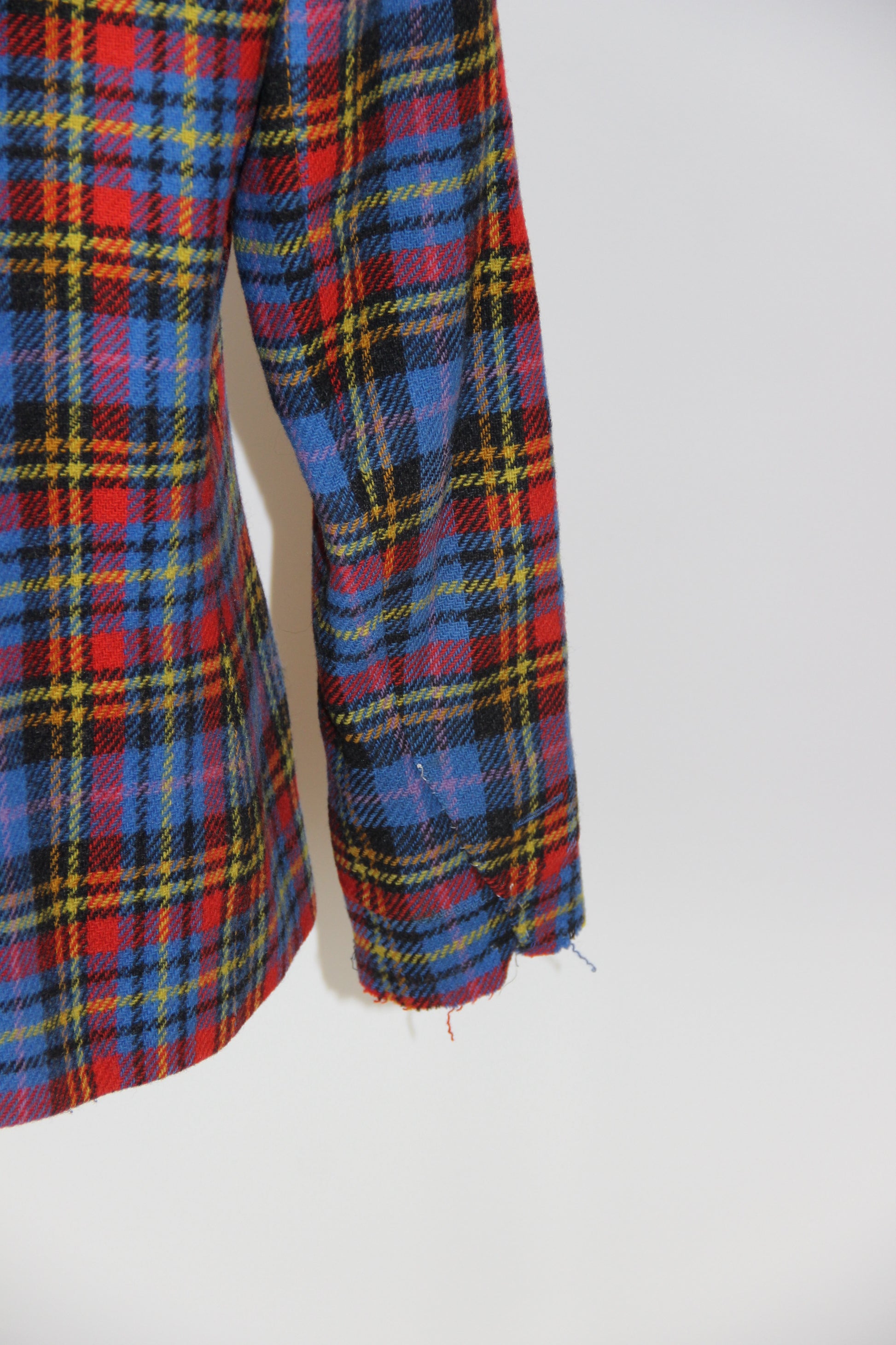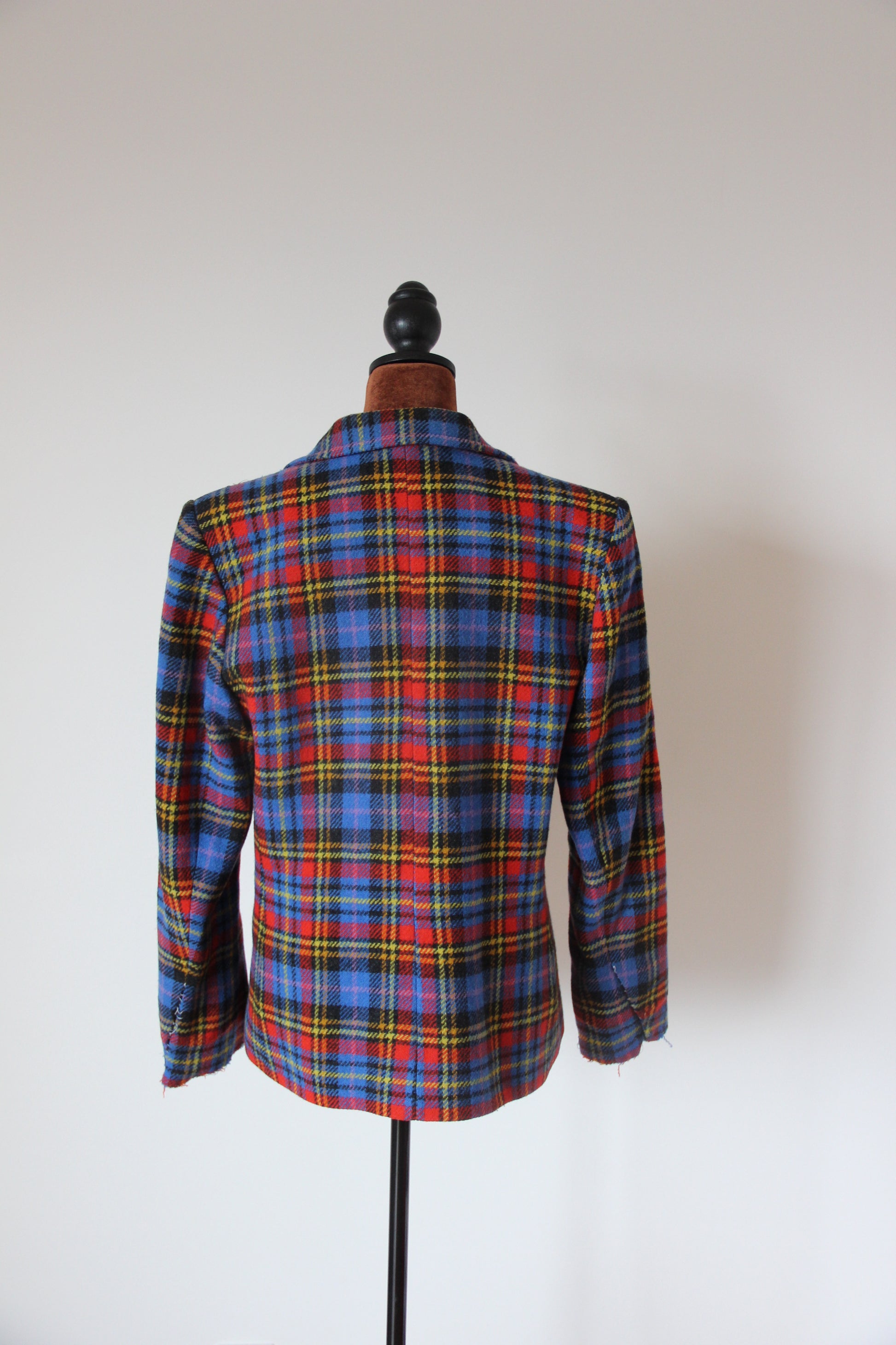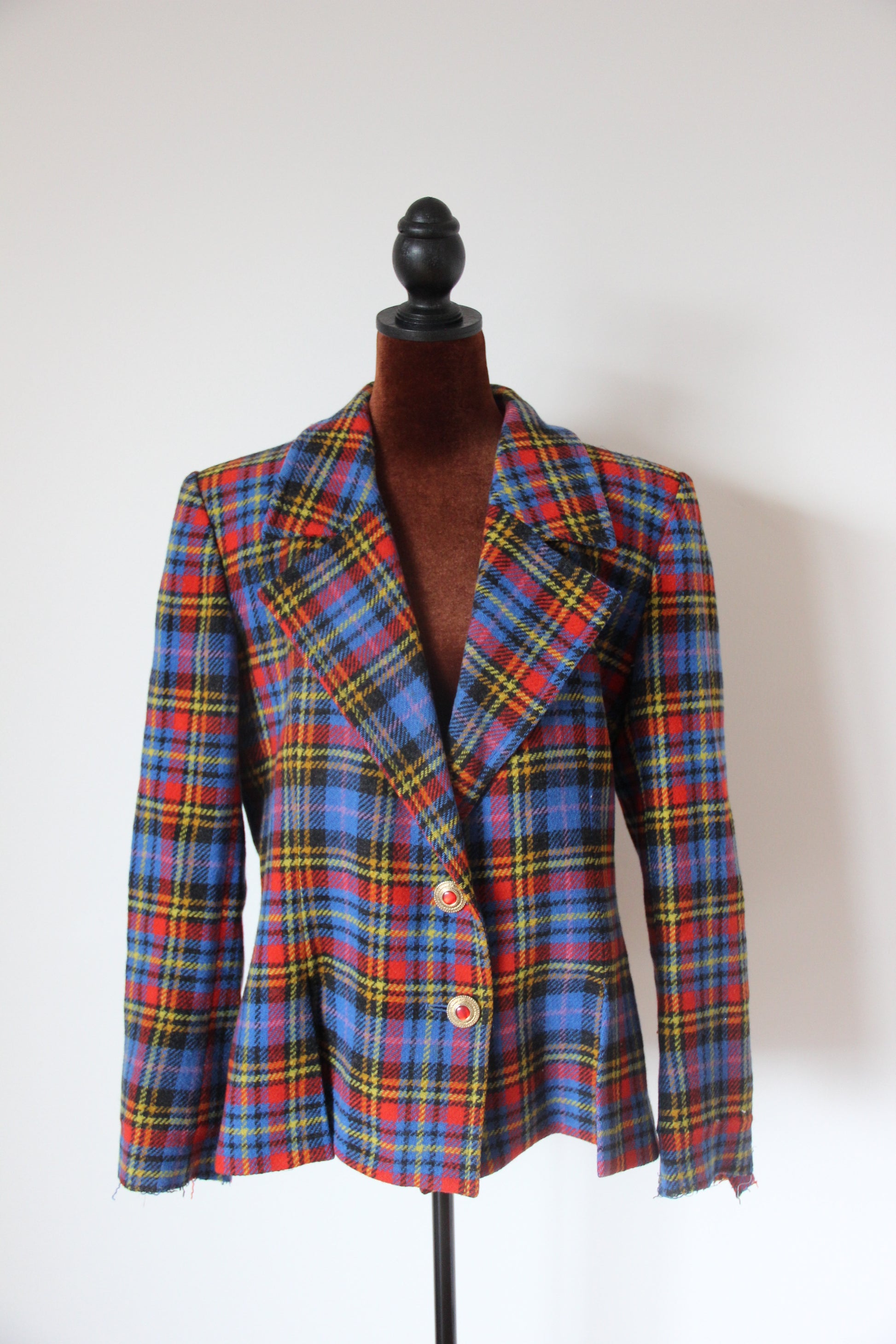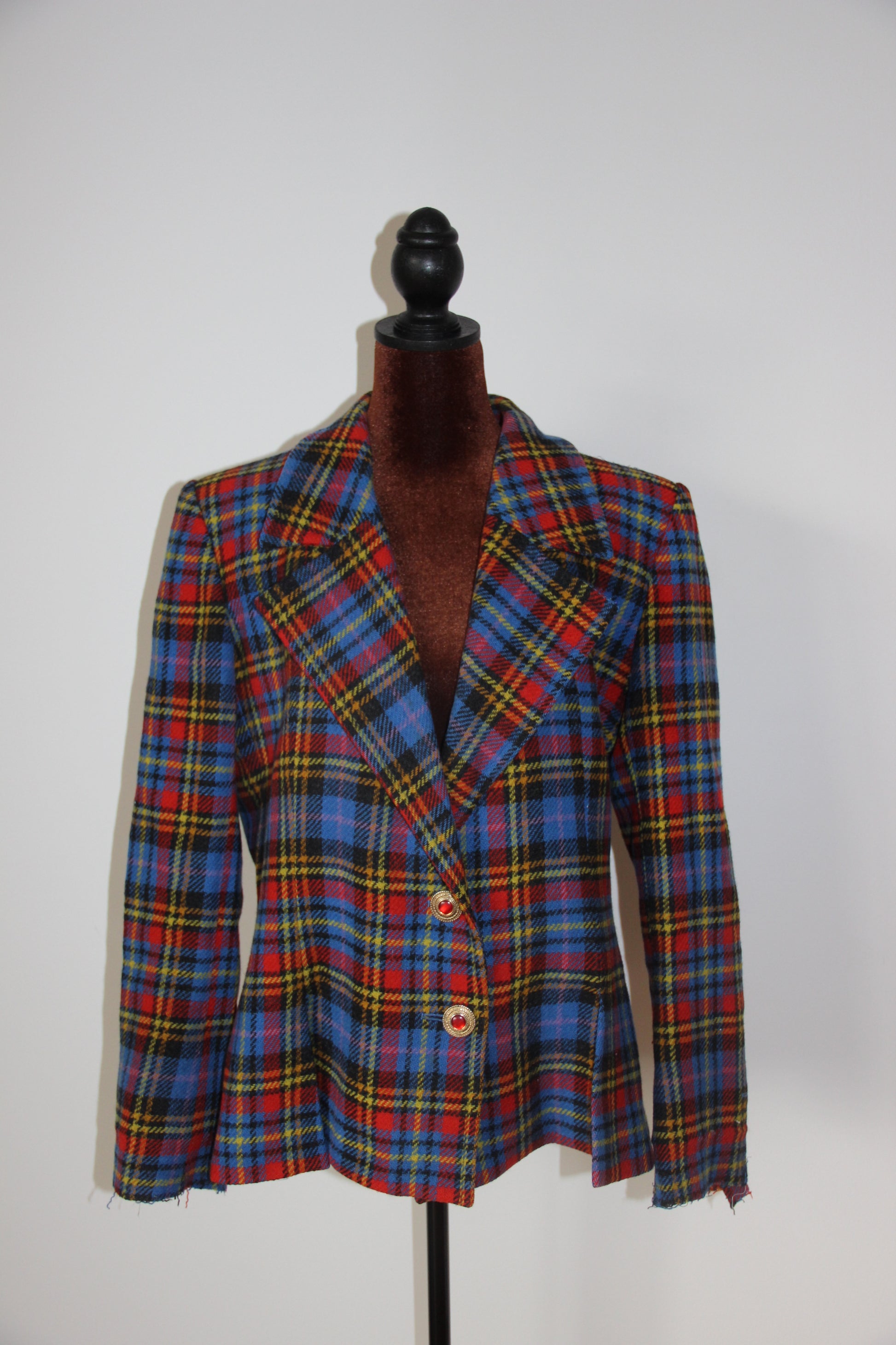 Veste en laine à l’imprimé tartan écossais. Coupe légèrement ajustée à la taille, épaules marquées par des épaulettes épaisses, fermeture par 2 boutons bijoux doré et pierre rouge d’origine. 2 poches latérales, 2 fentes sur le devant.